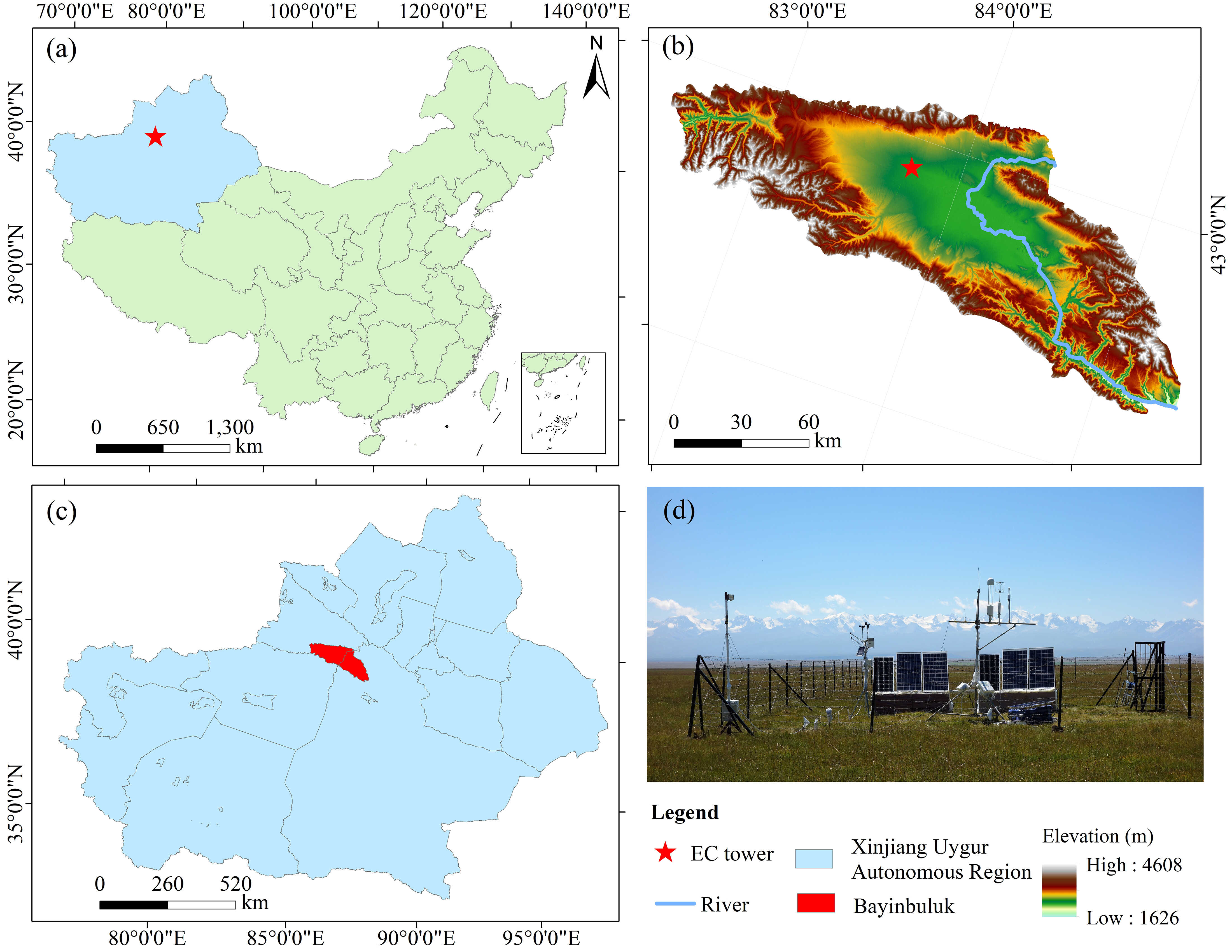 图1. 巴音布鲁克高原湿地地理位置(a, b, c)和本研究观测实验场(d)