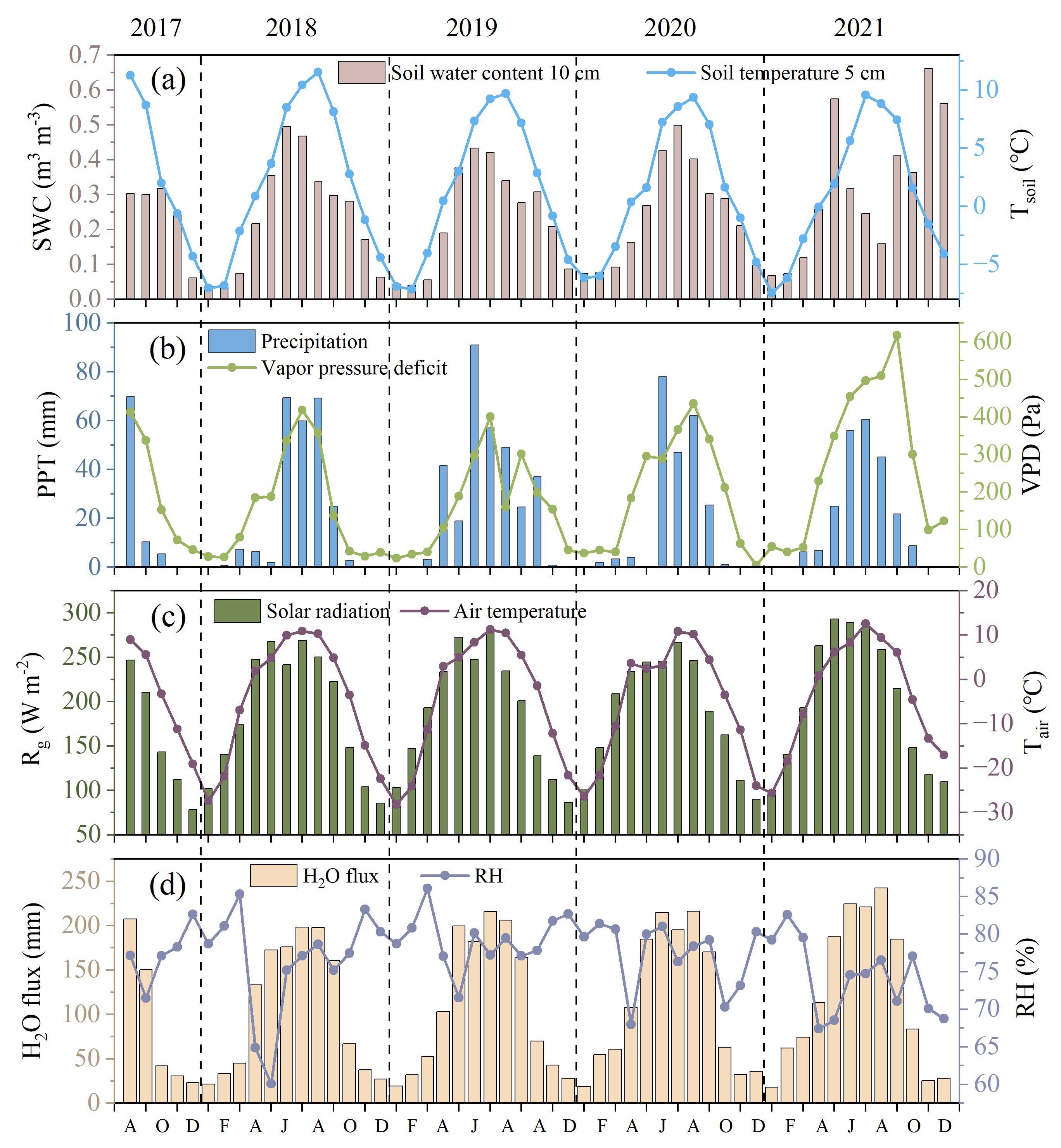 图2. 2017年8月至2021年12月巴音布鲁克草原环境因子的月均值(或总量)