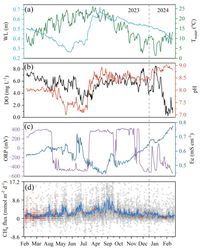 湖泊是内陆水域甲烷(CH₄)排放的重要热点。尽管其面积仅占地球表面积的约0.5%,却贡献了内陆水体约44%的CH₄排放量,是影响全球气候变化的重要自然源。其中,浅水湖泊由于水层浅、对气候变化响应迅速、底泥厌氧环境活跃,其CH₄产生与释放强度通常显著高于深水湖泊,因此成为全球碳循环与温室气体研究的重点对象。然而,与其他类型湖泊相比,喀斯特湖泊的CH₄排放机制仍认识不足,主要体现在三个方面:首先,喀斯特水体具有高碱度、高溶解无机碳以及地下水交换活跃等独特的水文—地球化学特征,使得传统淡水湖泊的排放规律难以直接适用;其次,现有研究多依赖短期或低频观测,难以揭示CH₄通量在小时—日—季节尺度上的动态变化;此外,CH₄生成的微生物代谢路径与湖泊整体通量变化之间的耦合关系尚未明确,导致排放驱动机制解析不足,并为全球尺度的CH₄排放估算带来较大不确定性。