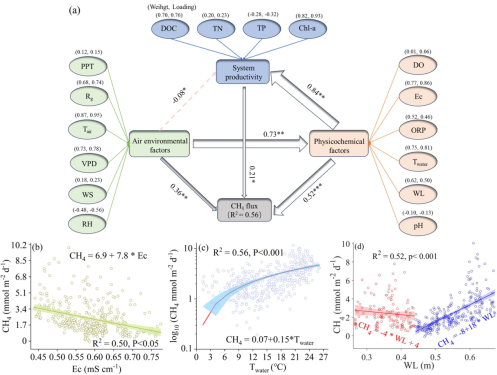 图2. CH4通量与各环境因子的路径方程模型以及线性关系