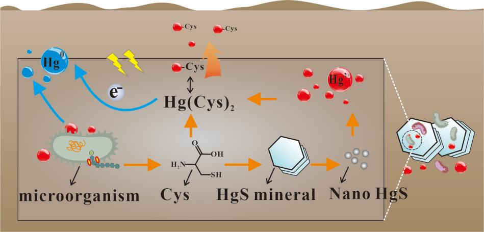 硫化汞(HgS)是自然环境中矿物结合态汞的最大汞库,通常被认为是惰性的和难以活化的。该团队揭示了一种新的微生物介导的HgS溶解机制。从中国万山汞矿区地表土壤中分离出多株耐汞细菌(Arthrobacter sp.WS-B1、Massilia sp.WS-B3、Serratia sp.WS-B5等),被证明能够分泌半胱氨酸,促进晶体HgS分解为HgS纳米颗粒和溶解态Hg,并最终向挥发性Hg(0)转化。这项研究揭示了HgS矿物的微生物转化、自然界中HgS纳米颗粒的潜在形成途径以及微生物介导的汞迁移转化风险。